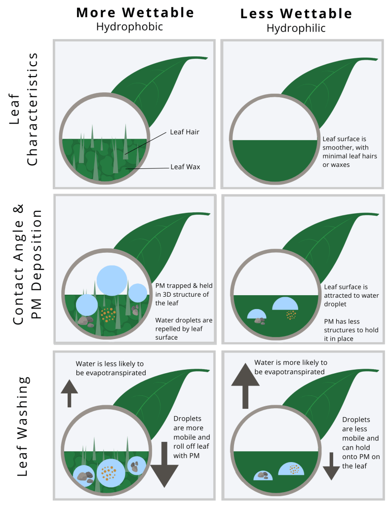 Leaf wettability is often measured to characterize the water-shedding properties of a leaf surface. Leaves with higher contact angles have hydrophobic properties, meaning that water is more easily shed from the leaf. They can be classified as non-wettable, highly non-wettable, or superhydrophobic. Leaf surfaces with lower contact angles have hydrophilic properties that cause water to be held on the leaf. They can be classified as wettable, highly wettable, or superhydrophilic.