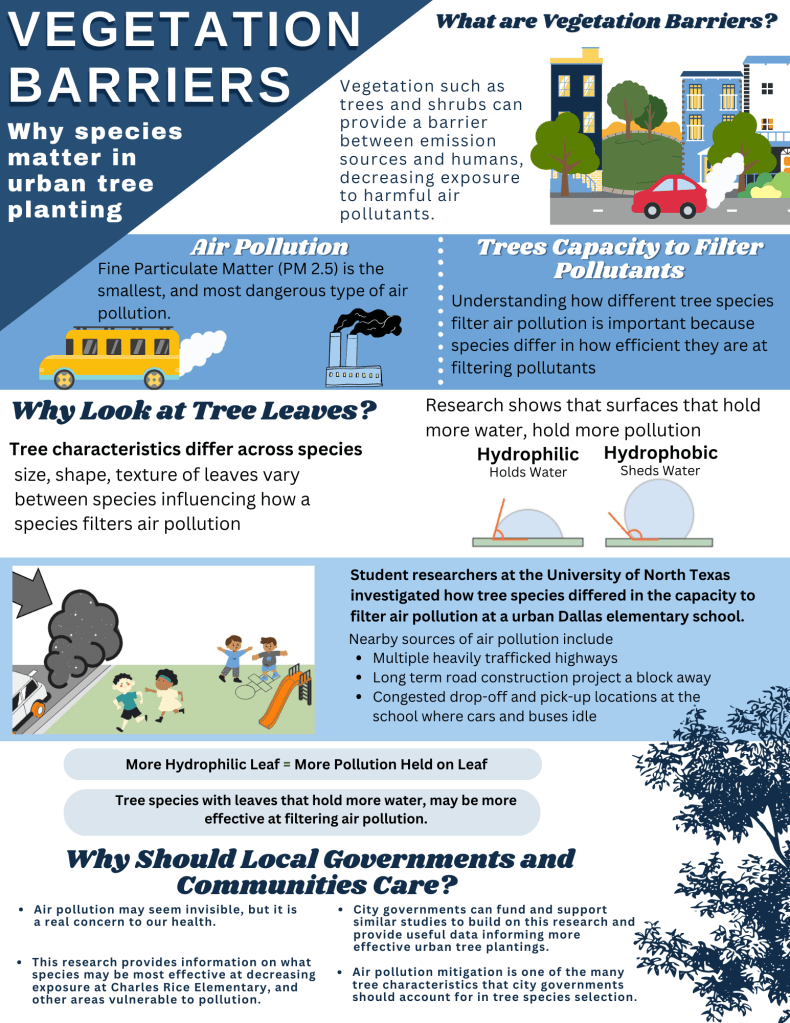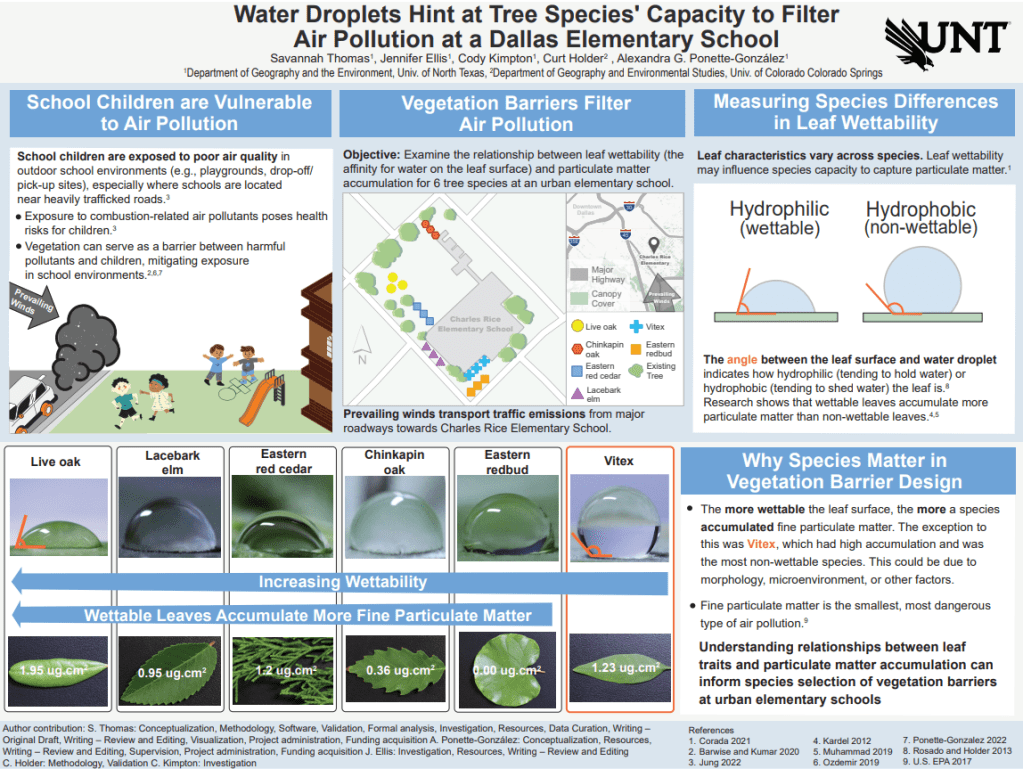 I studied the leaf wettability characteristics of tree species at a Dallas, TX elementary school to support a study commissioned by the Texas Trees Foundation. A goal of this report was to make suggestions on what tree species filter more air pollutants in an urban vegetation barrier.